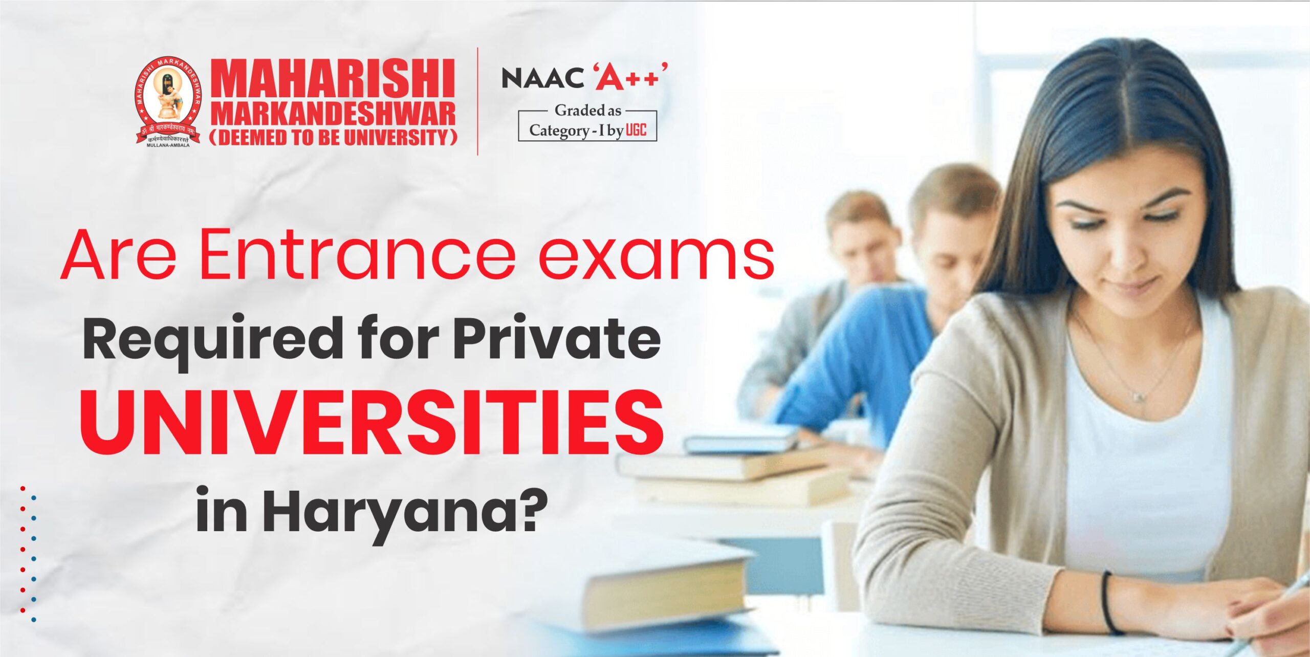 - Maharishi Markandeshwar (Deemed to be University), Mullana (MM(DU)); Ambala: One of the most established private universities in Haryana with a large portfolio of courses and a mix of entrance-based and merit-based admissions.